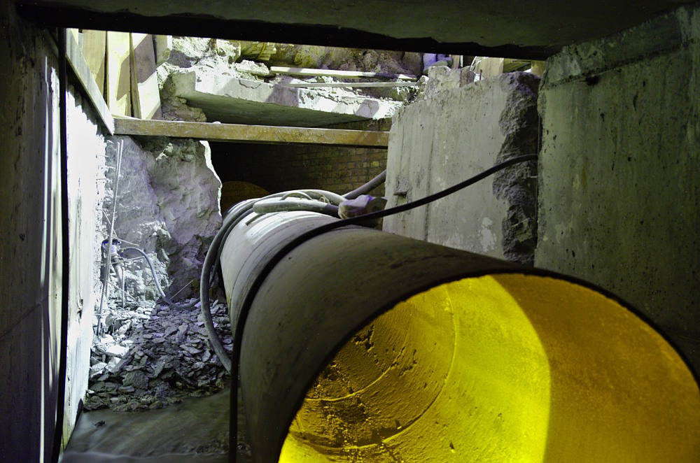 Проход в основном тоннеле стал свободнее, ибо под основание спилены старые опоры: кроме основной трубы в тоннеле нет ровным счётом ничего.